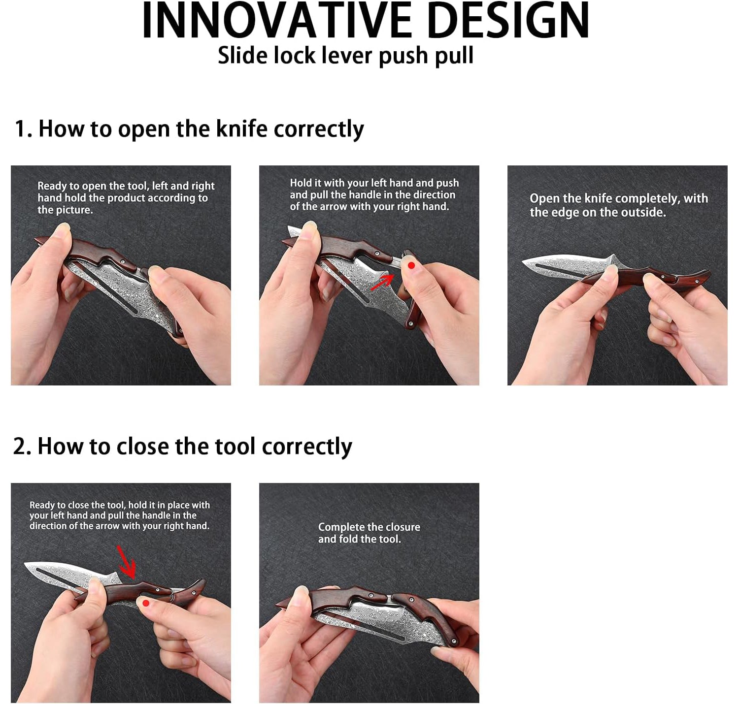 The folding knife features a unique mechanical structure and innovative operation. The triangular part at the end of the handle can act as a clip; simply push it lightly to open the blade. Similarly, press the triangular part at the end of the handle, and with a little force, you can pull out the blade. This modern design breaks traditional thinking and makes the operation easy and convenient.